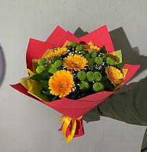 Утонченная флористическая композиция из нежнейшего цвета розы, кустовой хризантемы и зелени. Подарите такой букет той, к которой испытываете самые нежные чувства.